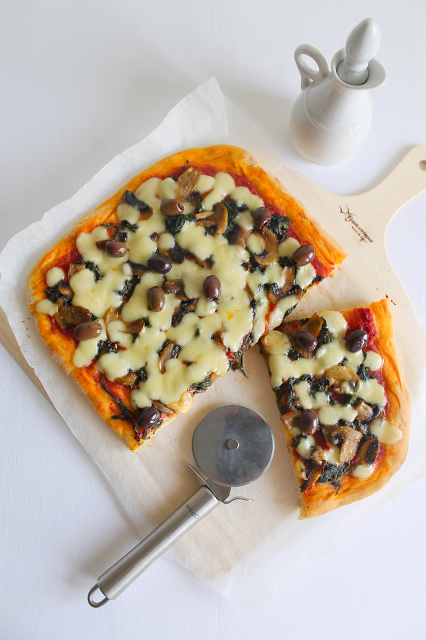 Trascorso il tempo di lievitazione, riprendete l’impasto e stendetelo sulla teglia direttamente con le mani unte d’olio. Non utilizzate il mattarello, altrimenti l’impasto si sgonfierà. Livellatelo bene, quindi versatevi sopra la passata di pomodoro ed infornate a 190-200°C per 20 minuti circa. Uscite quindi la teglia dal forno, distribuitevi sopra gli spinaci, i funghi, le olive ed infine la mozzarella ben sgocciolata e tagliata a cubetti piccoli. Infornate nuovamente e quando la mozzarella si è sciolta del tutto sfornate la pizza, conditela con un filo d’olio e servite. Ottima sia calda che tiepida. Volendo la potete consumare anche il giorno caldo ma prima riscaldatela in forno per qualche minuto appena.