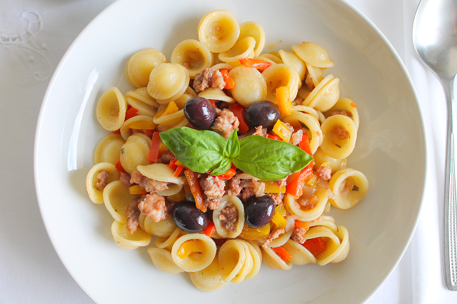 Orecchiette con Salsiccia,Peperoni e Olive diGaeta