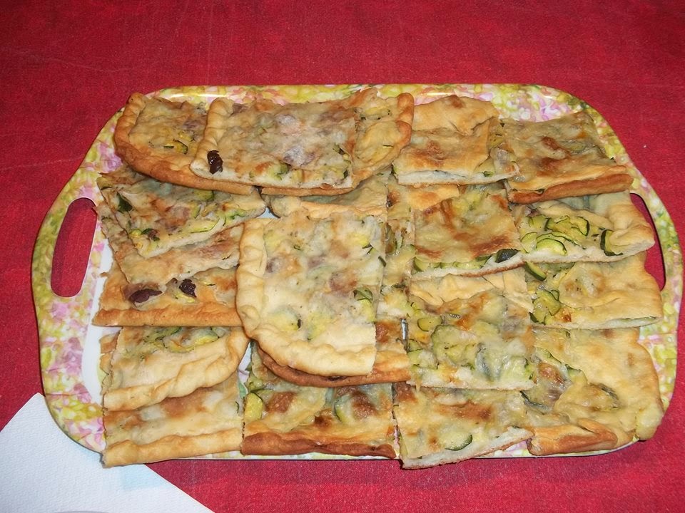 Stendere la pasta sulle teglie oleate e condire con le zucchine e cipolla, alici a pezzettini, un filo d’olio e olive snocciolate, ricoprire con la pasta per pizza in uno strato sottile, cuocere la pizza in forno caldo.