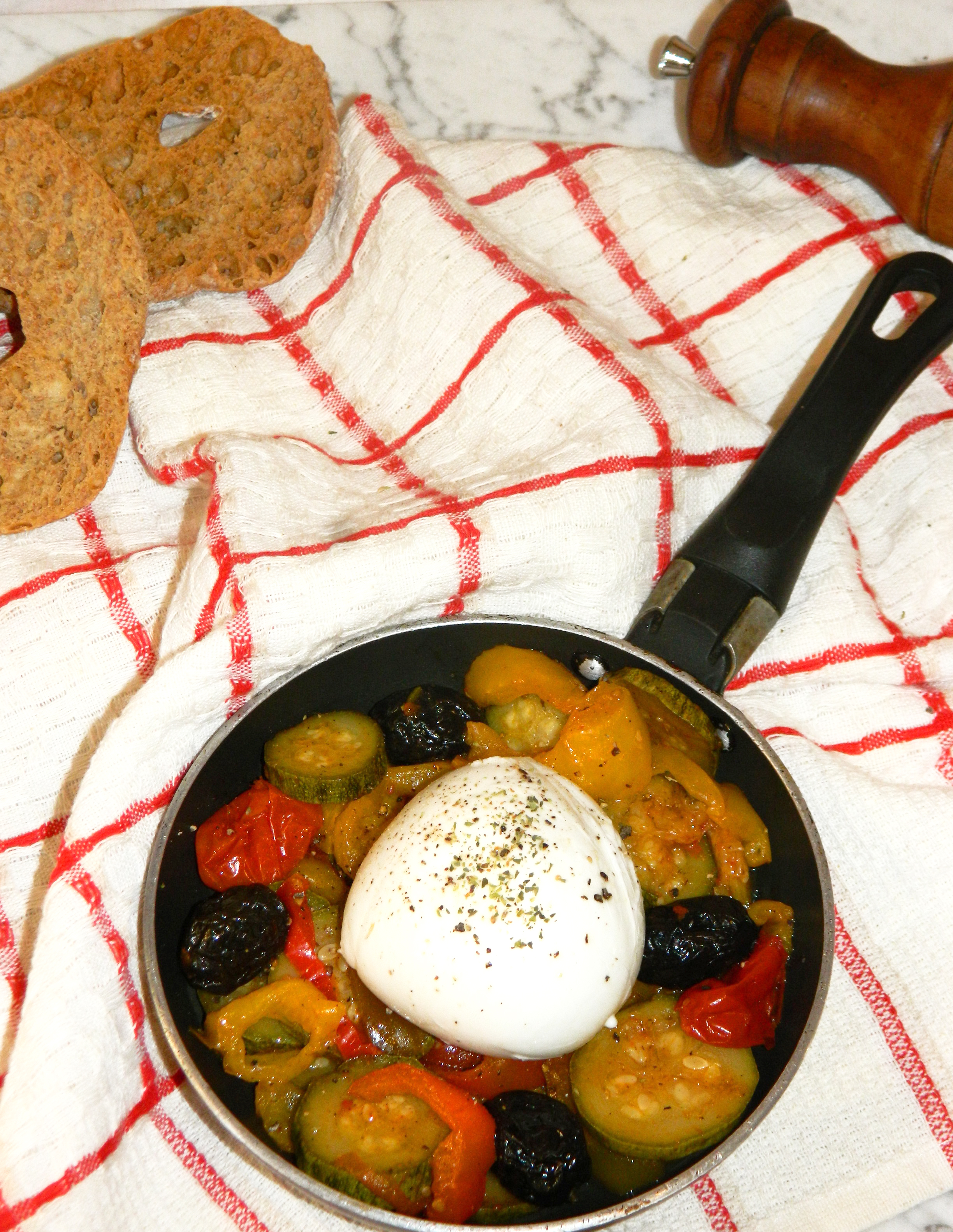 Sgocciolate le mozzarelle poi una volta che le verdure si sono raffreddate, poggiate la mozzarella condite con il pepe e servite.
