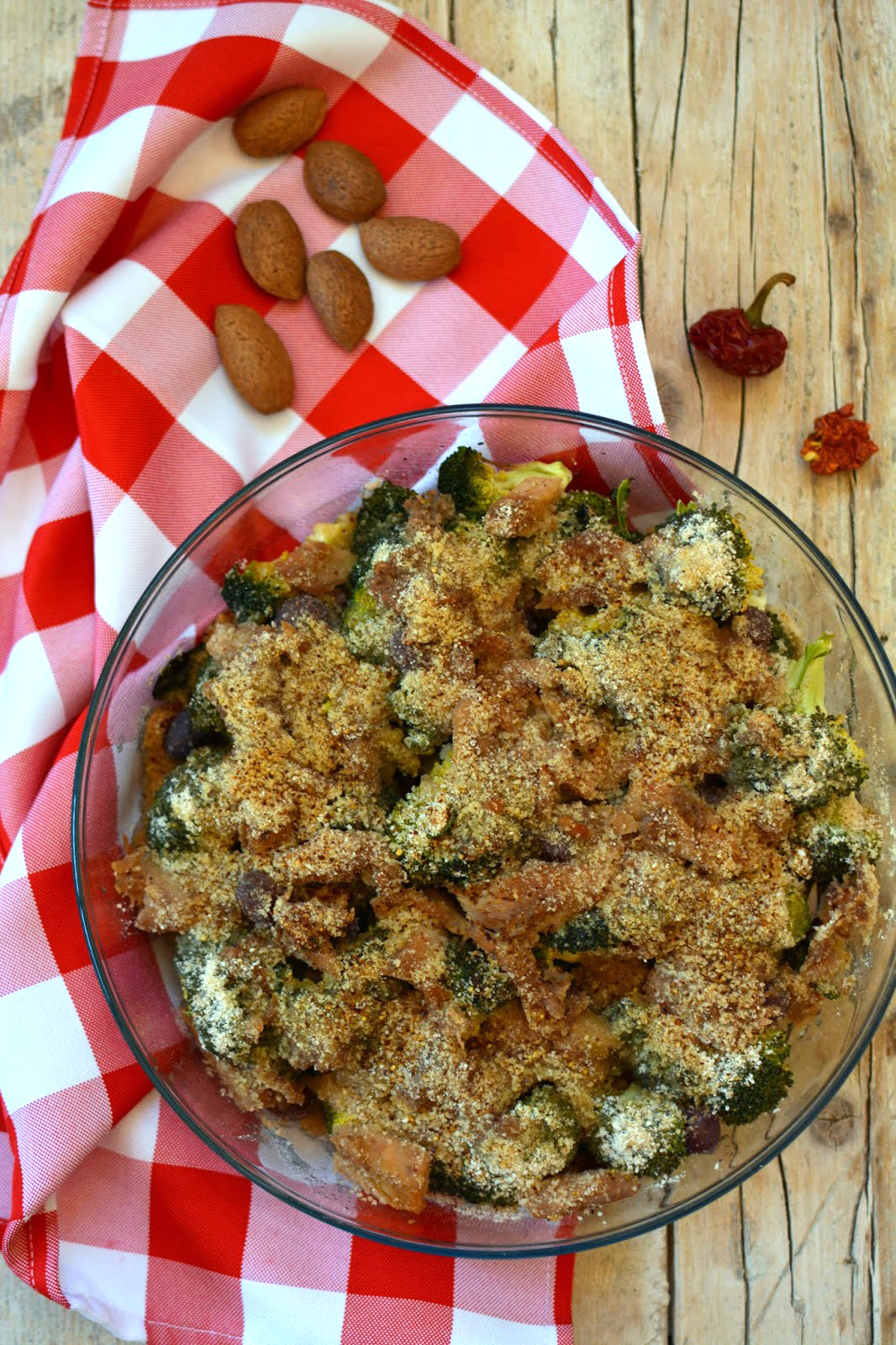 Per questa ricetta ti servono solo le sommità del broccolo, quindi metti i da parte i gambi per un’altra occasione e dividi le infiorescenze in cimette. Passale al microonde per 10 minuti alla massima potenza, in modo da scottarle conservandone la croccantezza. Mescolali con il tonno sgocciolato e le olive denocciolate. Sciogli la pasta d’acciughe nell’olio del tonno (sì, si può fare, nessuno è mai morto a causa dell’olio di conservazione del tonno) e utilizza la crema ottenuta per condire gli altri ingredienti. Sistemali in una pirofila che li contenga in un solo strato. Cospargilo con il pangrattato, mescolato al parmigiano e al peperoncino e inforna a 180° per circa 30 minuti.