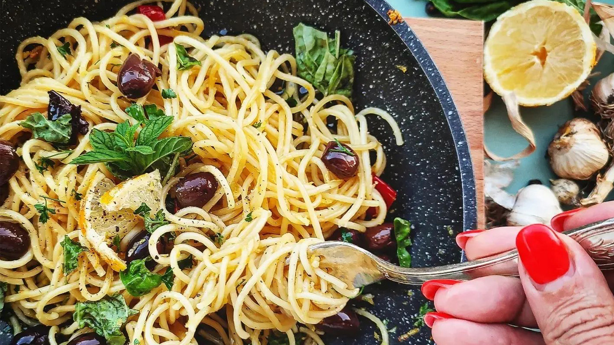Spaghetti al limone con olive
