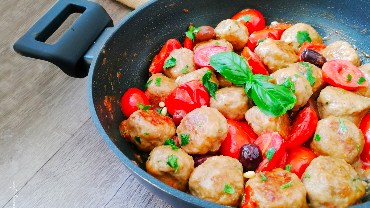 Le polpette alla mediterranea sono polpette al pomodorino fresco insaporite con vino bianco, olive ed erbe aromatiche. Eโ una ricetta facile che non prevede frittura ma il risultato รจ da urlo!