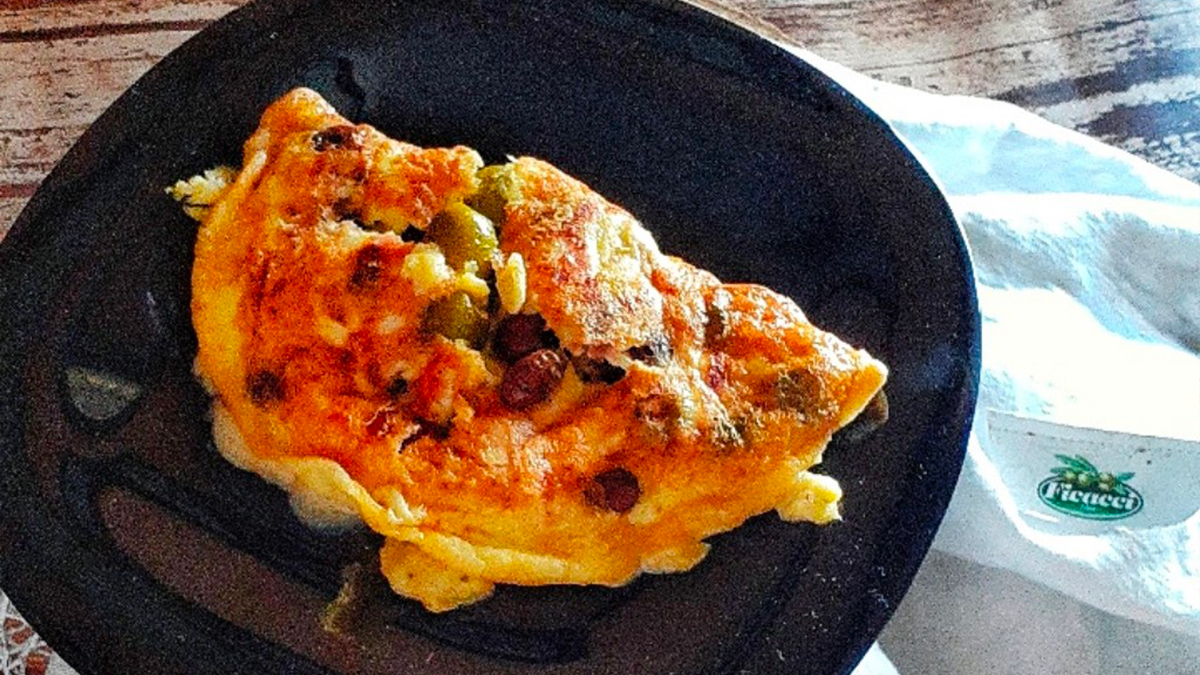 Sbattere le uova con formaggio, sale e pepe, riscaldare poi una padella con un pochino di olio e versarvi il composto, appena inizierà a rapprendersi da un lato metterci il salame, la sottiletta e le olive, ricoprire con l’altra metà e far cuocere pochi minuti.