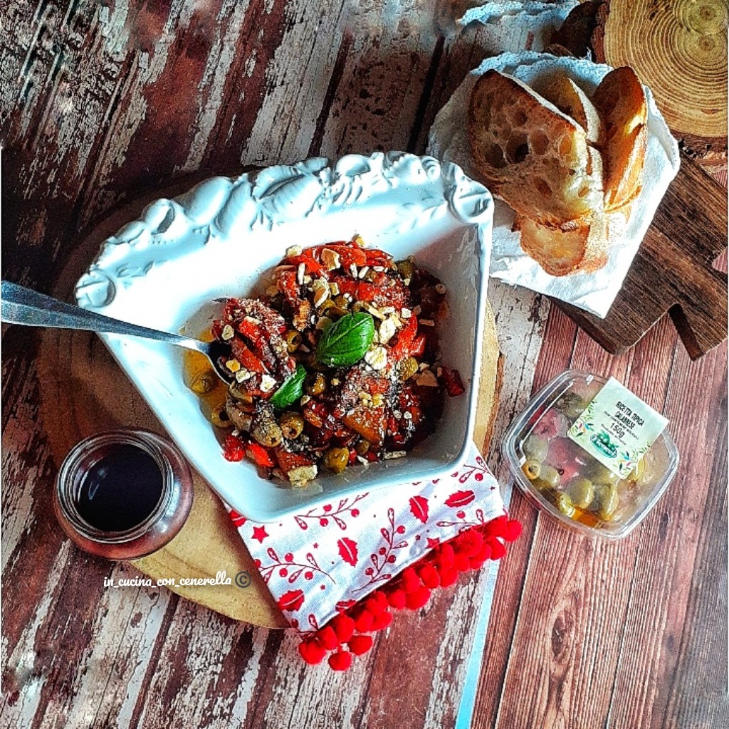 Pulire i peperoni dai semi e fai filamenti bianchi interni, tagliarli poi a listarelle e metterli a cuocere in padella con olio e sale, quasi a fine cottura aggiungere i capperi e le olive e far cuocere altri 5 minuti poi spegnere e sbriciolarci il tarallo sopra ed amalgamare e aggiungere anche il basilico!