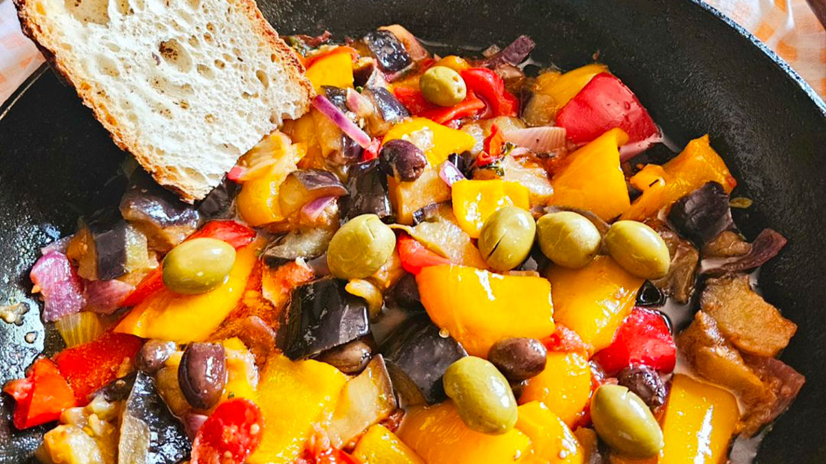 Padellata di peperoni, melanzane e olive miste