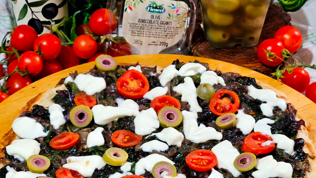 Pizza con cicoria, olive, ciliegini e mozzarella